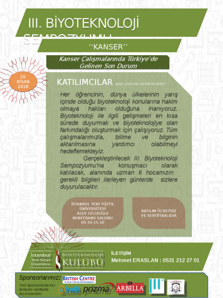 Her öğrencinin, dünya ülkelerinin yarış içinde olduğu biyoteknoloji konularına hakim olmaya hakları olduğuna inanıyoruz. Biyoteknoloji ile ilgili gelişmeleri en kısa sürede duyurmak ve biyoteknolojiye olan farkındalığı oluşturmak için çalışıyoruz. Tüm çalışmalarımızla bilime ve bilginin aktarılmasına yardımcı olabilmeyi hedeflemekteyiz. 20 Nisan 2018 Cuma günü gerçekleştireceğimiz "III. Biyoteknoloji Sempozyumu" çağımızın en büyük problemi haline gelmiş olan ‘’Kanser’’ temasıyla gerçekleşecek olup alanının doğayen isimlerini ağırlayarak keyifli, bilgi dolu bir gün geçirmeniz sağlanacaktır. Çeşitli hediye ve sürprizlerimizin olduğu bu günde siz değerli katılımcılarımızı görmek bizi oldukça onure edecektir.